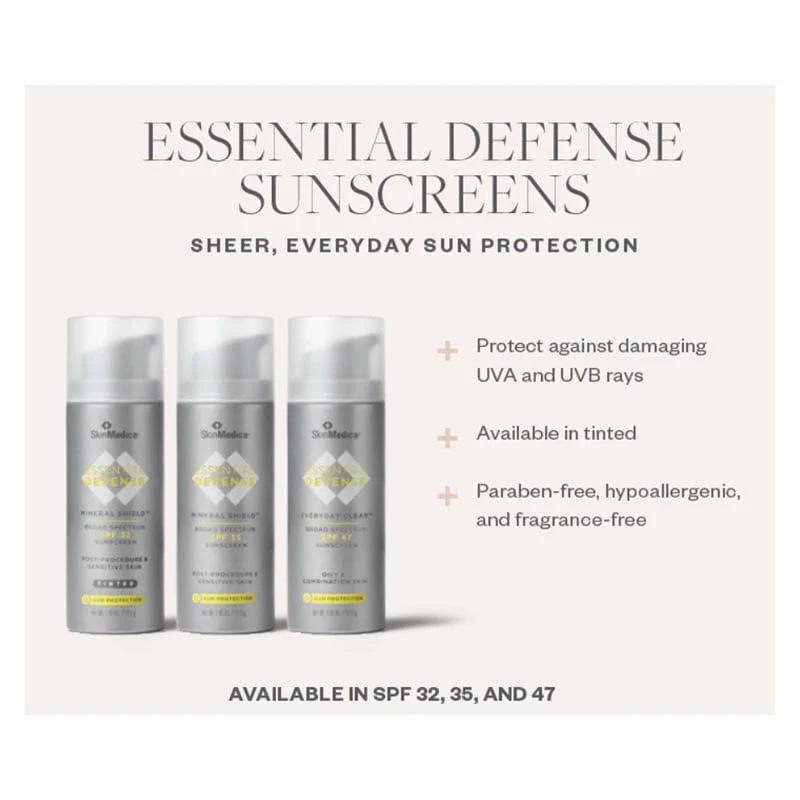 SkinMedica Essential Defense Mineral Shield Broad Spectrum SPF 32 Tinted is a slightly tinted, lightweight formulation that gives you a high level of UVA protection, along with UVB coverage in a mineral shield that’s gentle to your skin.*